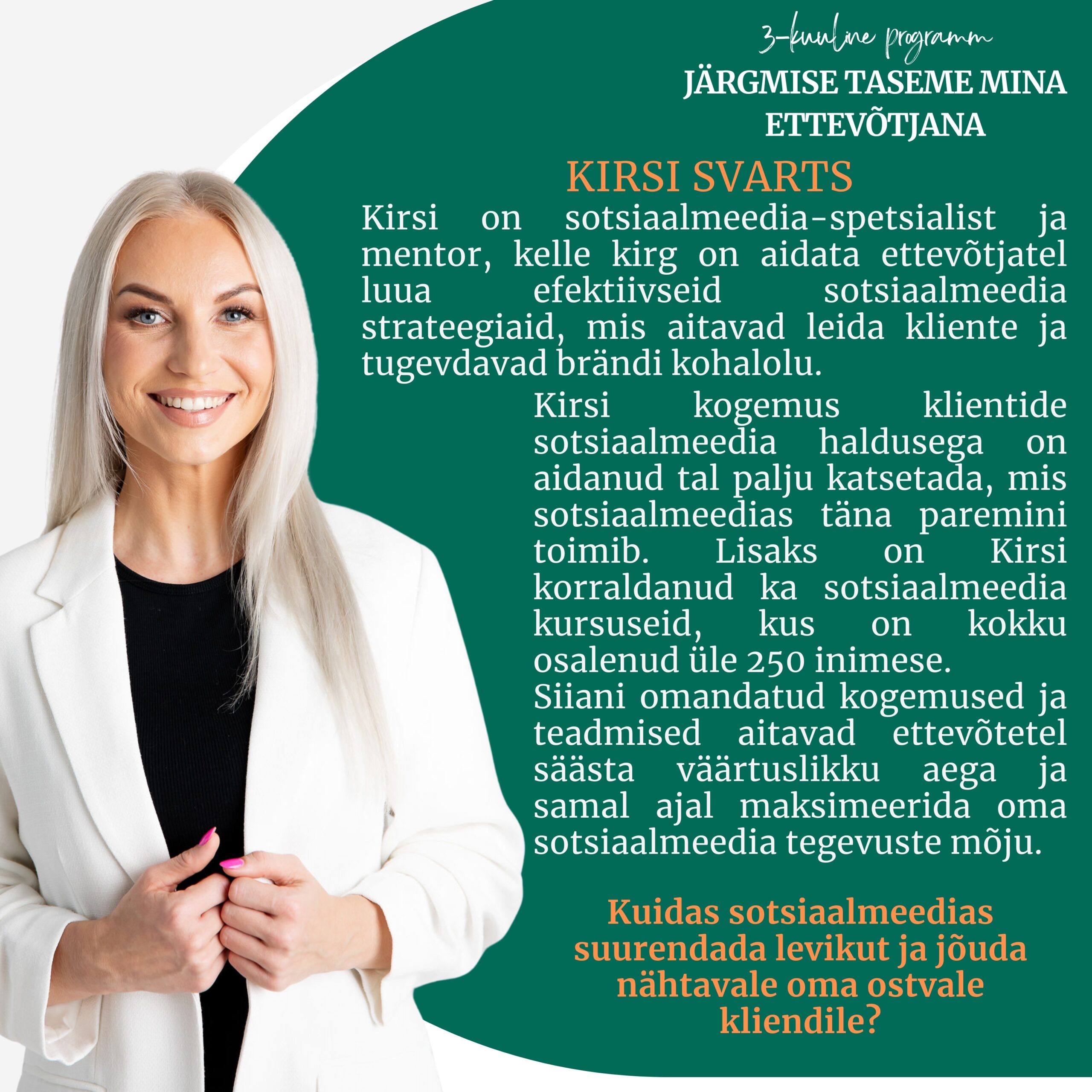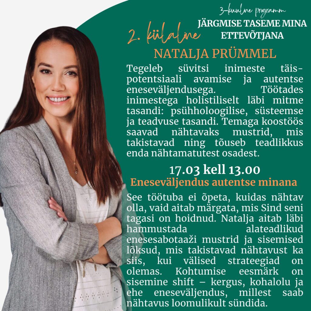👉 Tahad viia iseenda ja oma ettevõtte järgmise tasemeni? Uute kogemuste ja tulemusteni! Rohkemate klientideni! Tunda rohkem rõõmu, nautimist ja rahulolu oma teekonnal ettevõtjana?