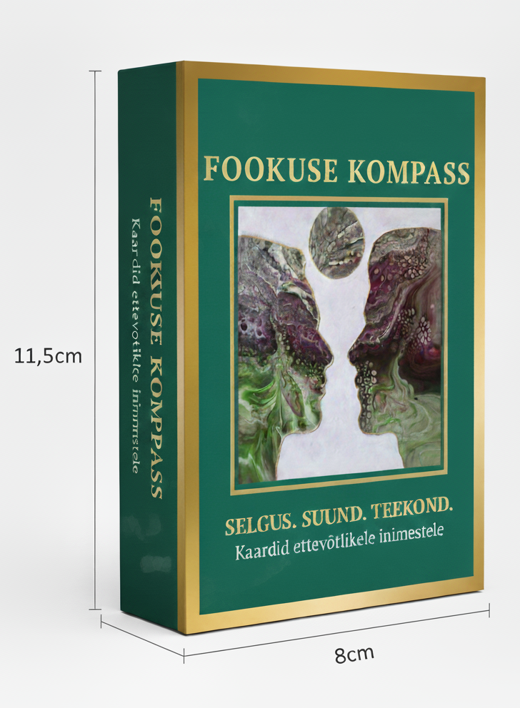Fookuse Kompass on 56 kaardist koosnev enesearengu tööriist, mis aitab Sul teha selgemaid otsuseid, hoida fookust ja liikuda kindlameelselt oma teekonnal edasi. Iga kaart sisaldab sügava sõnumiga teksti ja toetavat visuaali, mis aitab Sul vastuseid enda seest leida.